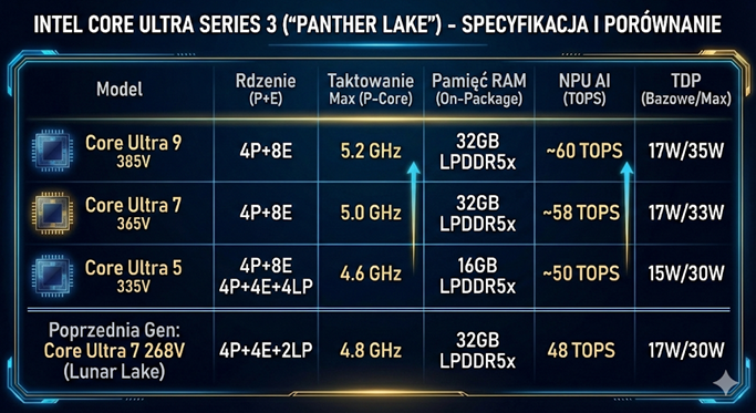Choć modele Ultra 9 i 7 kradną nagłówki gazet wydajnością, to Core Ultra 5 Series 3 będzie najczęściej wybieranym układem w przetargach i zakupach firmowych. Intel pozycjonuje tę serię jako idealny balans między ceną a możliwościami nowoczesnego AI PC.
