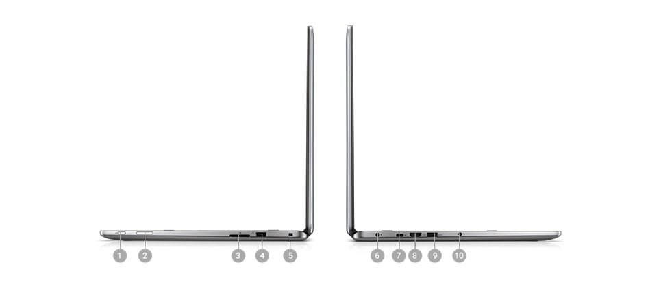 1. Przycisk zasilania | 2. Sterowanie głośnością | 3. Czytnik kart pamięci SD | 4. USB 2.0 | 5. Gniazdo blokady Noble | 6. Wejście prądu stałego | 7. Port USB 3.1 Gen 1 Type-C | 8. HDMI | 9. Port USB 3.1 Gen 1 z funkcją PowerShare | 10. Gniazdo audio