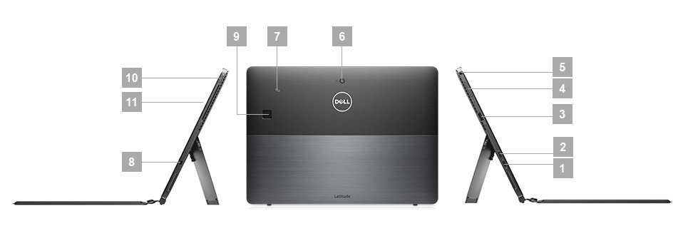 1. Złącze USB typu C | 2. Port Thunderbolt 3 (opcjonalny) | 3. USB 3.1 pierwszej generacji | 4. Regulator głośności | 5. Gniazdo audio typu combo | 6. Kamera World-Facing | 7. Opcjonalny moduł NFC | 8. Gniazdo blokady Noble | 9. Czytnik linii papilarnych (opcjonalny) | 10. Przycisk Windows/przycisk ekranu głównego | 11. Czytnik kart inteligentnych (opcjonalny)