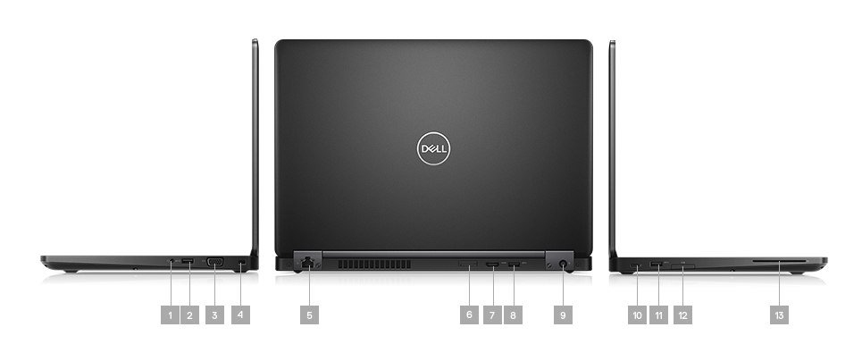 1. Gniazdo audio typu combo | 2. Port USB 3.1 pierwszej generacji z funkcją PowerShare | 3. VGA | 4. Gniazdo blokady klinowej Noble | 5. RJ 45 | 6. Gniazdo na kartę uSIM (opcjonalnie) | 7. HDMI | 8. USB 3.1 pierwszej generacji | 9. Zasilanie | 10. Złącze DisplayPort™ przez Type-C | 11. USB 3.1 pierwszej generacji | 12. Gniazdo karty SD | 13. Czytnik kart Smart Card (opcjonalny)
