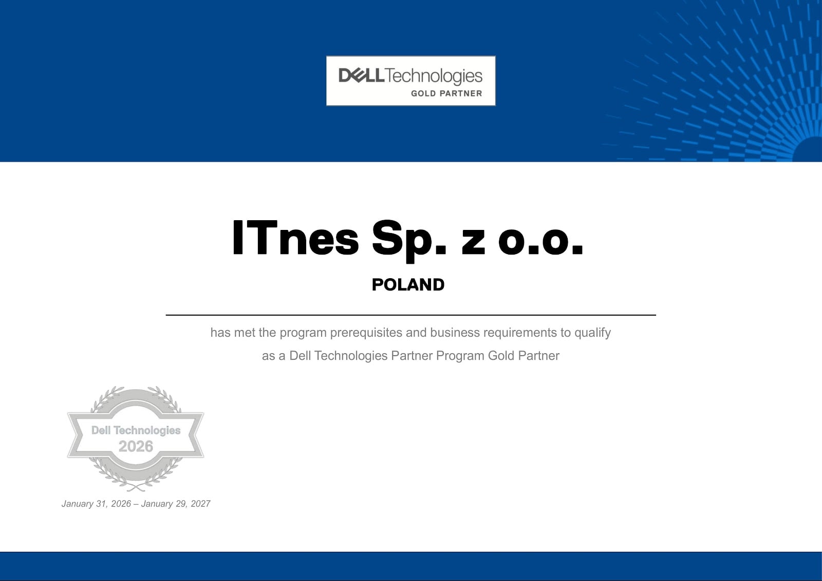 W świecie nowoczesnych technologii stabilność i kompetencje dostawcy są kluczem do sukcesu każdego przedsiębiorstwa. Z ogromną satysfakcją informujemy, że firma ITnes.pl | IT for BUSINESS oficjalnie utrzymała status Dell Technologies Gold Partner. Certyfikat ten obowiązuje do 29 stycznia 2027 roku i jest potwierdzeniem naszej najwyższej dbałości o standardy obsługi Klienta biznesowego.