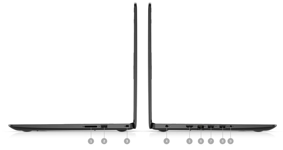 1. SD Card Reader | 2. USB 2.0 | 3. Wedge Shaped Lock Slot | 4. Power Jack | 5. HDMI | 6. RJ-45 | 7. USB 3.1 Gen 1 Type-A | 8. USB 3.1 Gen 1 Type-A | 9. Headphone/Mic