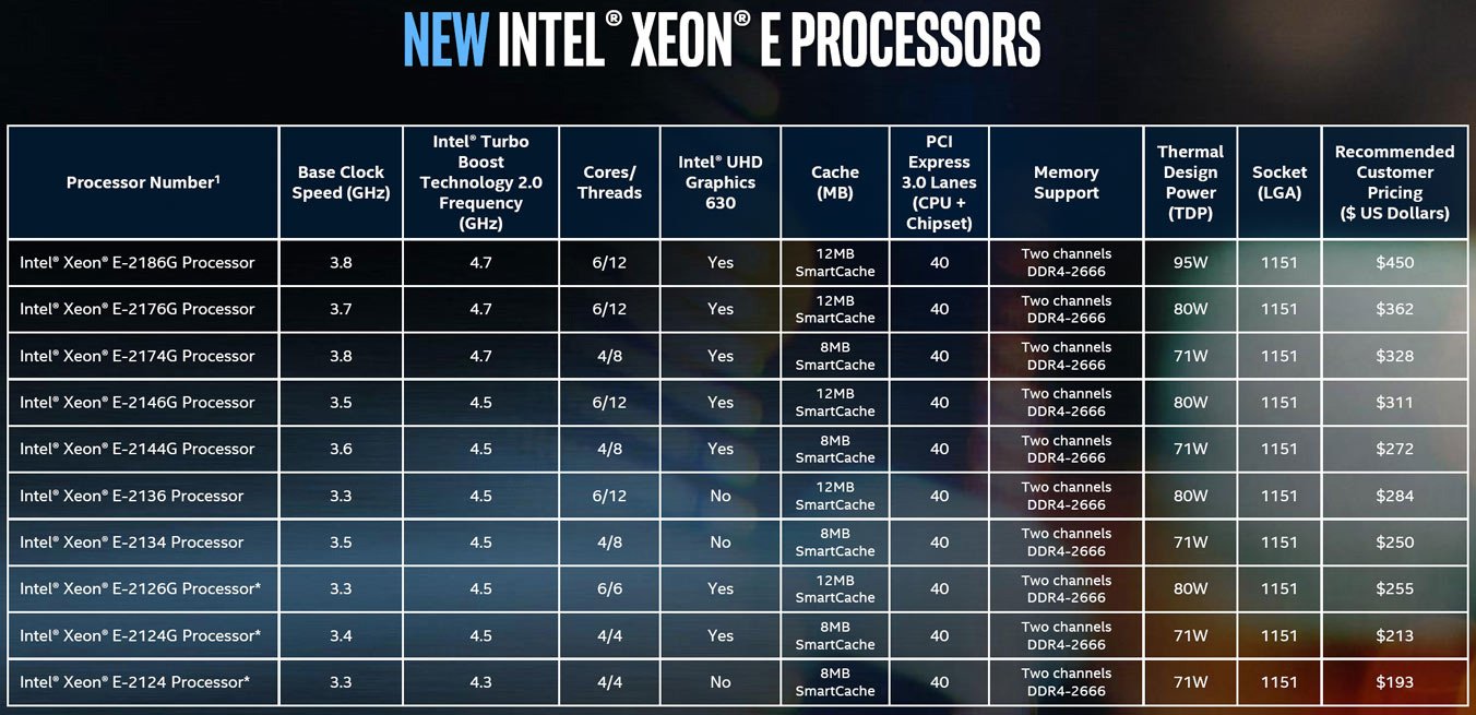Wszystkie nowe Xeony E-2100 korzystają z gniazda LGA1151 i wymagają do pracy płyty głównej z chipsetem Intel C246. Chipy mogą współpracować z maksymalnie 64 GB pamięci DDR4 z korekcją ECC, a cała platforma udostępnia łączenie 40 linii PCIe 3.0, niezależnie od wybranej jednostki. Jak wspomnieliśmy wcześniej, duża część procesorów ma na pokładzie układ graficzny Intel UHD Graphics P630. Wersje bez tej jednostki można rozpoznać po braku litery G w nazwie.