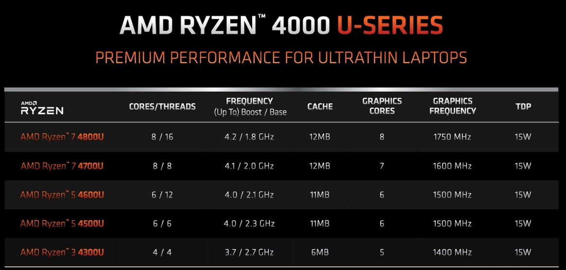AMD Ryzen 3 4300U to jedno z najnowszych APU z rodziny Renoir i jest najniższym modelem w ofercie AMD. Całość konstrukcji wyprodukowano w 7 nm procesie technologicznym TSCM. Procesor ten składa się z 4 rdzeni i 4 wątków, co stawia go w gorszej pozycji do wyżej wymienionych modeli procesorów. Z kolei dużo lepiej prezentuje się bazowe taktowanie zegara, które wynosi 2,7 GHz, a w trybie turbo maksymalnie do 3,7 GHz. Wraz z układem APU zintegrowana jest karta graficzna Radeon Graphics z 5 blokami CU. TDP tego procesora AMD wynosi standardowe 15W, z możliwością podniesienia limitu energetycznego do wartości 25W (cTDP). Podsumowując, jest to dość niezłe APU dedykowane dla laptopów z tańszej półki.