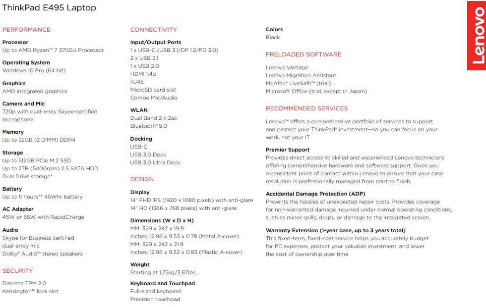 Specyfikacja techniczna serii Lenovo ThinkPad E495: