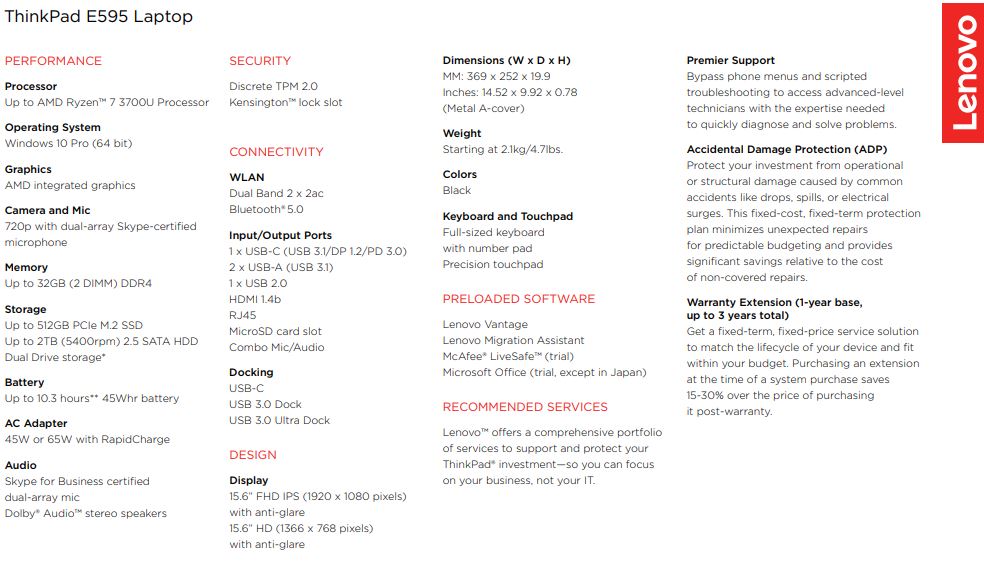 Specyfikacja techniczna serii Lenovo ThinkPad E595: