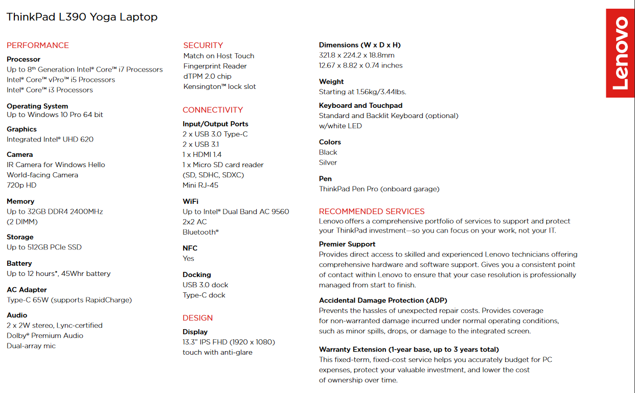 Laptopy Lenovo ThinkPad L390 Yoga dostępne będą w konfiguracji z dotykową, konwertowalną matryca 13.3-cala o rozdzielczości Full HD (13.3" (338mm) FHD (1920x1080), anti-glare, LED backlight, IPS, 300 nits, 16:9 aspect ratio, 800:1 contrast ratio, 72% gamut, 170° viewing angle). Maksymalna obsługiwana ilość pamięci RAM to 32GB (2x16), magazynem danych są dyski półprzewodnikowe na złącze M.2 PCIe NVMe. Wbudowany akumulator Li-ion 45Wh (z technologią Lenovo Rapid Charge - ładowanie do 80% pojemności w 1 godzinę) zapewnia czas pracy do 12 godzin, dołączony zasilacz ma moc od 65W. Laptopy z serii ThinkPad L390 Yoga wspomagają bezpieczeństwo takich technologiami jak Discrete TPM 2.0. Lenovo ThinkPad L390 Yoga oferuje szeroki zakres portów I/O takich jak: MicroSD card reader, 2 x USB 3.1 Gen 1 (one Always On), 2 x USB 3.1 Type-C Gen 1, 1 x HDMI 1.4b, Ethernet extension connector, headphone / microphone combo jack, security keyhole. Waga biznesowych laptopa L390 Yoga to 1.56kg. Systemem operacyjnym jest Microsoft Windows 10 Pro. Laptopy z serii ThinkPad L objęte są gwarancją producenta na okres 1 roku realizowaną w trybie door-to-door, którą można rozbudować o czas i formę. Najpopularniejszą formą rozszerzenia gwarancji jest rozszerzenie gwarancji Lenovo ThinkPad Seria L do 3 lat on-site.