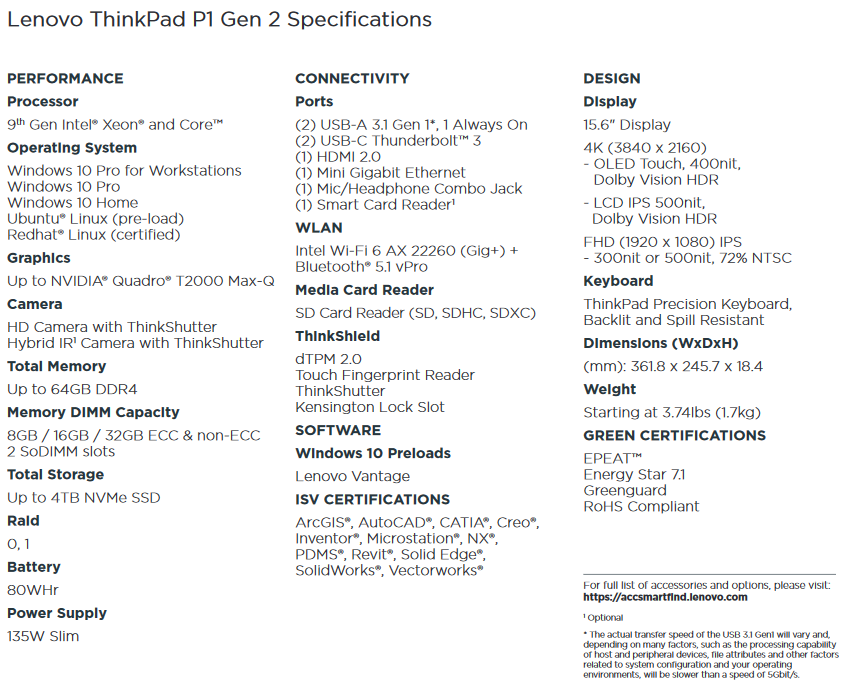 Specyfikacja techniczna mobilnych stacji roboczych Lenovo ThinkPad P1 Gen 2