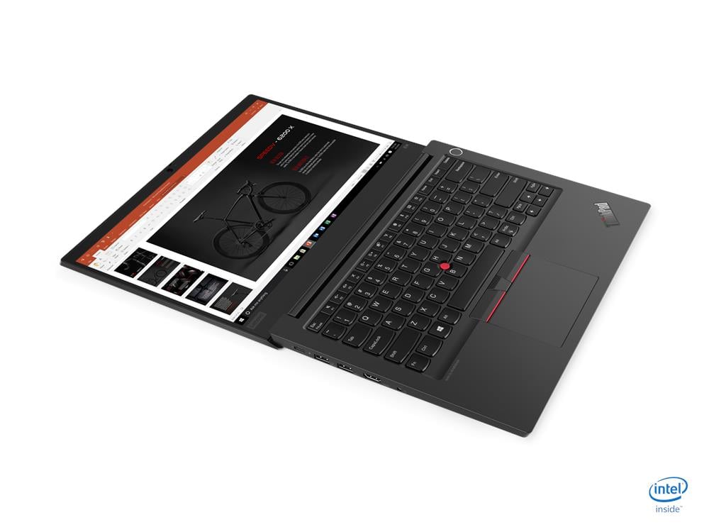Lenovo ThinkPad E14 to biznesowy notebook przeznaczony do pracy w domu i małym biurze. Solidna obudowa posiadająca certyfikat MIL-STD-810G wykonana tworzywa sztucznego, dodatkowo wygodna klawiatura - TrackPoint oraz duży gładzik. Laptopy z tej serii posiadają 14-calowy ekran z wąskimi ramkami FHD (1920x1080) IPS o jasności 250 nitów i kontraście 700:1 z powłoką Anti-glare. Wyposażone są w procesory Intel Core Comet Lake 10. generacji (i3-10110U,i5-10210U,i7-10510U,i7-10710U) do 16 GB RAM 2666Mhz (jedno złącze SODIMM), obsługują do dwóch dysków (jeden 2,5 cala oraz jeden w formacie M.2 2280 PCIe NVMe). Dostępne są konfiguracje ze zintegrowany układem graficzny Intel UHD Graphics lub kartą graficzną AMD Radeon RX 640. Mimo małych rozmiarów laptopy z tej serii posiadają bogaty zestaw portów i złączy (1x USB 2.0, 2x USB 3.1 Gen 1 (one Always On),1x USB 3.1 Type-C Gen 1 (with the function of Power Delivery and DisplayPort), HDMI 1.4b, Ethernet (RJ-45), headphone / microphone combo jack). Wbudowany akumulator 45Wh zapewnia czas pracy do 12h, oraz wspiera technologię Rapid Charge - ładowanie do 80% w około 1h.