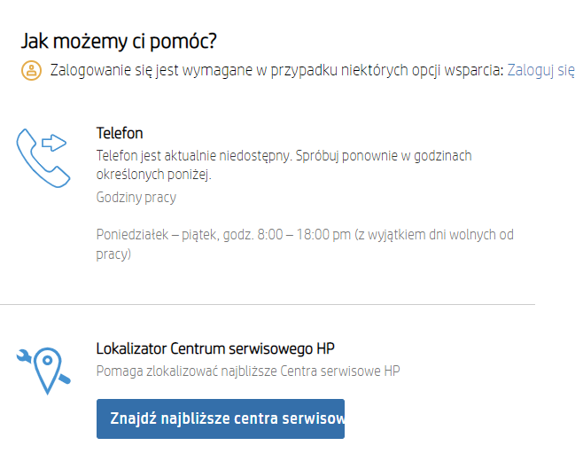 Na kolejnej stronie można skontaktować telefonicznie się z technikiem w określonych godzinach pracy dla danego typu urządzenia (lub/i formy gwarancji). Lub od razu skontaktować się z najbliższym Centrum serwisowych firmy HP w celu diagnozy awarii oraz uzyskania wsparcia gwarancyjnego.