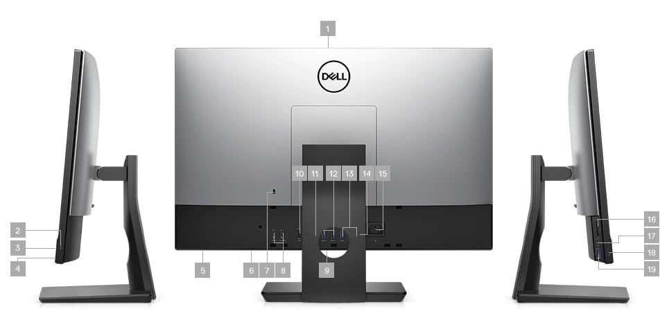 1. Camera (front) | 2. Hard Drive Activity Light | 3. Power Button (front) | 4. LED/Power-button Status Light | 5. Display Built-in Self-Test Button | 6. Speakers (front) | 7. Security Cable Slot | 8. HDMI Port (2) | 9. Microphone (front) | 10. DisplayPort (DP++) | 11. RJ-45 | 12. USB 3.1 Ports with Power on/Wake-up Support (2) | 13. USB 3.1 Gen 2 (2) | 14. Audio Out Port | 15. Power Connection | 16. SD Card Reader | 17. USB 3.1 Type-C™ Port | 18. Headset Port | 19. USB 3.1 Type-A Gen 1 with PowerShare