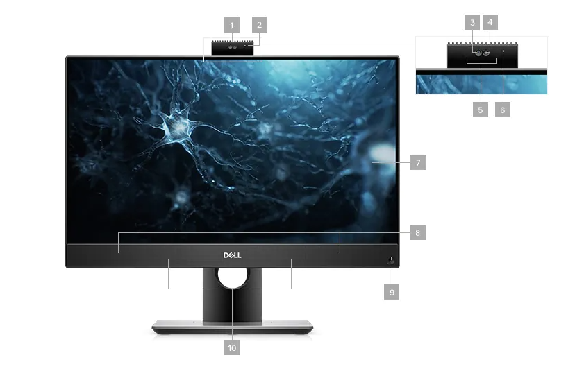 1. Full HD Webcam | 2. Camera Status Light | 3. IR Camera | 4. Full HD IR Camera | 5. IR Emitter | 6. Camera Status Light | 7. Display | 8. Speakers | 9. Power Button/Power Status Indicator | 10. Array Microphones