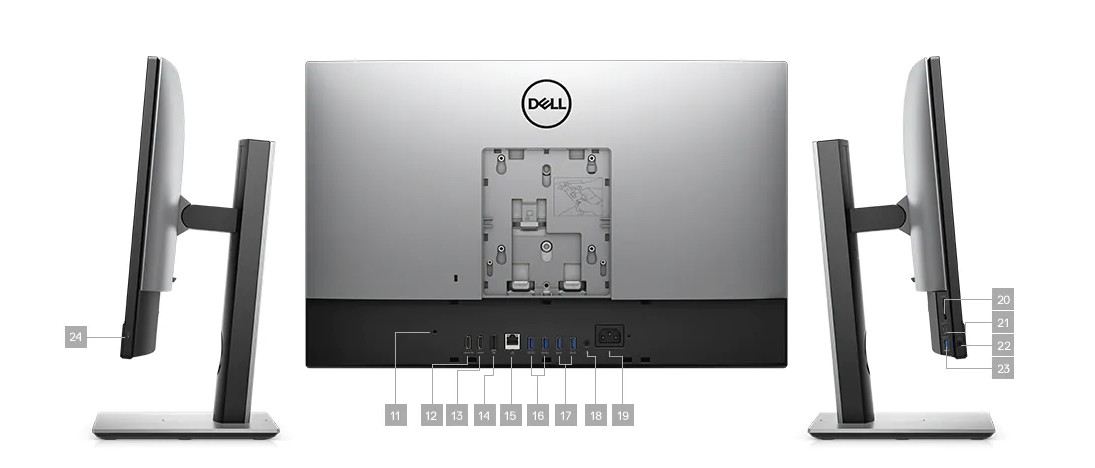 11. Cable Cover Screw Hole | 12. HDMI-In Port | 13. HDMI-Out Port | 14. DP++1.4/HDCP 2.3 Port | 15. RJ-45 Port 10/100/1000 Mbps | 16. USB 3.2 Gen2 Type-A Ports With Smart Power On | 17. USB 3.2 Gen2 Type-A Ports | 18. Line-Out Audio Port | 19. Power Connector | 20. SD 4.0 Card Slot | 21. USB 3.2 Gen2 Type-C Port | 22. Universal Audio Jack | 23. USB 3.2 Gen1 Type-A Port With Powershare | 24. Hard Drive Status Indicator