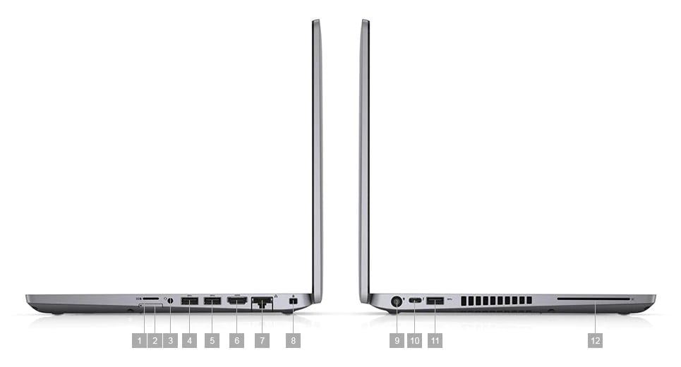 1. gniazdo na kartę uSIM | 2. Czytnik kart pamięci uSD | 3. Gniazdo zestawu słuchawkowego | 4 porty USB 3.1 pierwszej generacji | 5. Port USB 3.1 pierwszej generacji z funkcją PowerShare | 6. Port HDMI 1.4b | 7. Port RJ-45 | 8. Gniazdo blokady Noble | 9. Złącze zasilania | 10. Port USB Type-C™ 3.1 drugiej generacji z obsługą standardów Power Delivery i DisplayPort (opcjonalnie Thunderbolt™ 3) | 11. Port USB 3.1 pierwszej generacji | 12. Czytnik kart smart (opcjonalny)
