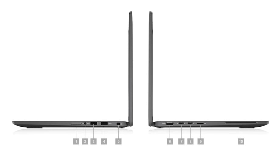1 gniazdo na opcjonalną zewnętrzną kartę uSIM | 2. Uniwersalne gniazdo audio | 3. Port USB 3.2 pierwszej generacji | 4. Port USB 3.2 pierwszej generacji z funkcją PowerShare | 5. Gniazdo blokady klinowej | 6. Port HDMI 2.0 | 7. Port Thunderbolt™ 3 z obsługą standardu Power Delivery i złącza DisplayPort (USB Type-C™) | 8. Port Thunderbolt™ 3 z obsługą standardu Power Delivery i złącza DisplayPort (USB Type-C™) | 9. Czytnik kart pamięci Micro SD 4.0 | 10. Czytnik kart Smart Card (opcjonalny)