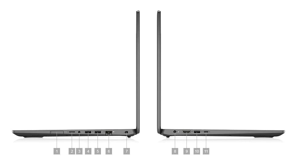 1. Taca na opcjonalną zewnętrzną kartę uSIM | 2. Czytnik kart pamięci microSD 3.0 | 3. Uniwersalne gniazdo audio | 4. USB 2.0 | 5. USB 3.2 pierwszej generacji | 6. Gniazdo RJ-45 z diodą LED stanu | 7. Gniazdo blokady klinowej | 8. Gniazdo zasilania (okrągłe 4,5 mm) z diodą LED stanu | 9. HDMI 1.4 | 10. USB 3.2 pierwszej generacji | 11. Port dokowania / USB Type-C™ 3.2 pierwszej generacji z obsługą standardów Power Delivery 3.0 i DisplayPort 1.2