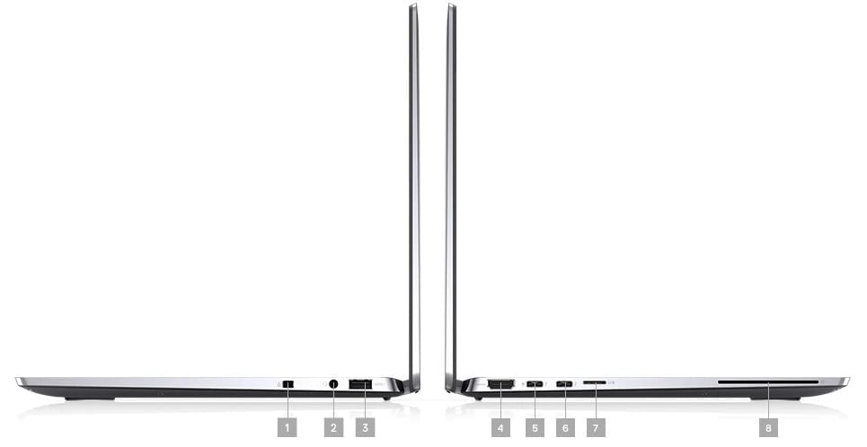 1. Gniazdo blokady klinowej | 2. Gniazdo audio typu combo | 3. Port USB 3.1 pierwszej generacji z funkcją PowerShare | 4. HDMI 2.0 | 5 i 6. 2 porty Thunderbolt™ 3 z obsługą standardu Power Delivery i złącza DisplayPort | 7. Czytnik kart pamięci microSD 4.0 | 8. Opcjonalny stykowy czytnik kart Smart Card