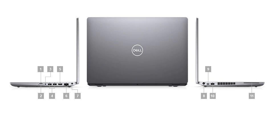 1. Memory card reader | 2. Optional SIM card slot | 3. Headphone jack | 4. USB 3.1 gen & USB 3.1 gen 1 with PowerShare | 5. HDMI | 6. RJ-45 port | 7. Wedge-shaped lock slot | 8. Power adapter port | 9. USB-C with Thunderbolt™ | 10. USB 3.1 gen 1 | 11. Smart card reader (optional)
