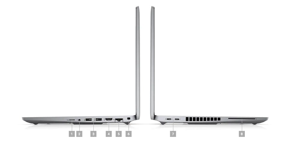 1. MicroSD card reader | 2. Audio out | 3. (2) USB 3.2 Gen 2 Type A (1x power enabled) | 4. HDMI 2.0 | 5. RJ-45 | 6. Wedge lock slot | 7. (2) Thunderbolt 4 USB-C ports with power-in | 8. Smart Card (optional).