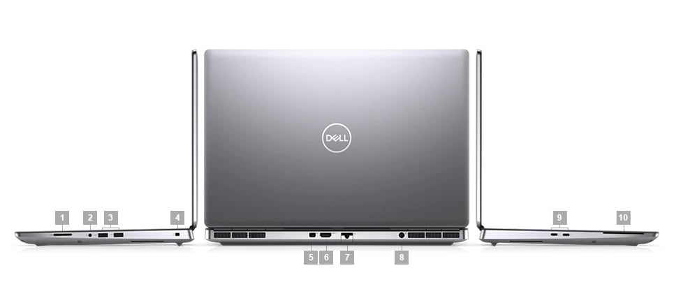 1. SD Card Reader | 2. Universal Audio Jack | 3. 2x USB 3.2 Gen 1 with Powershare | 4. Cable Lock | 5. Mini DP 1.4 | 6. HDMI 2.0 | 7. RJ-45 | 8. Power | 9. 2x USB 3.2 Gen 2 Type C Thunderbolt™ | 10. Smart Card Reader