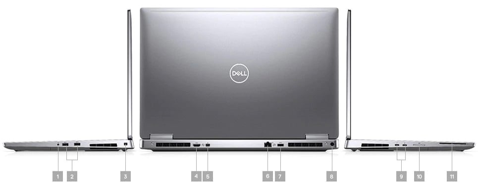 1. Gniazdo słuchawkowe | 2. Porty USB 3.1 pierwszej generacji z funkcją PowerShare | 3. Gniazdo blokady klinowej Noble | 4. Port HDMI 2.0 | 5. Port Mini-DisplayPort 1.4 | 6. Złącze RJ-45 | 7. Port USB 3.1 pierwszej generacji z funkcją PowerShare | 8. 1 port zasilacza sieciowego | 9. Thunderbolt™ 3 Type-C | 10. Czytnik kart SD | 11. Czytnik kart Smart Card (opcjonalny)
