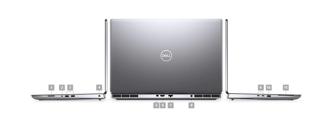 1. SD Card Reader | 2. Universal Audio Jack | 3. 2x USB 3.2 Gen 1 with Powershare | 4. Cable Lock | 5. Mini DP 1.4 | 6. HDMI 2.0 | 7. RJ-45 | 8. Power | 9. 2x Thunderbolt™ 3.2 Type C | 10. USB 3.2 Gen 1 Type A | 11. Smart Card Reader