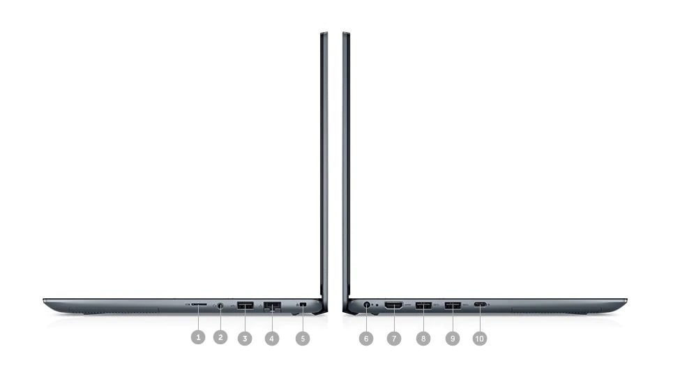 1. Czytnik kart pamięci Micro SD (SD, SDHC, SDXC) | 2. Złącze combo słuchawek/mikrofonu | 3. USB 2.0 | 4. Złącze Ethernet RJ-45 | 5. Gniazdo blokady klinowej | 6. Wejście zasilania | 7. HDMI 1.4b | 8. Port USB 3.1 Type-A pierwszej generacji | 9. Port USB 3.1 Type-A pierwszej generacji | 10. Port USB 3.1 Type-C™ pierwszej generacji (DP/zasilanie)