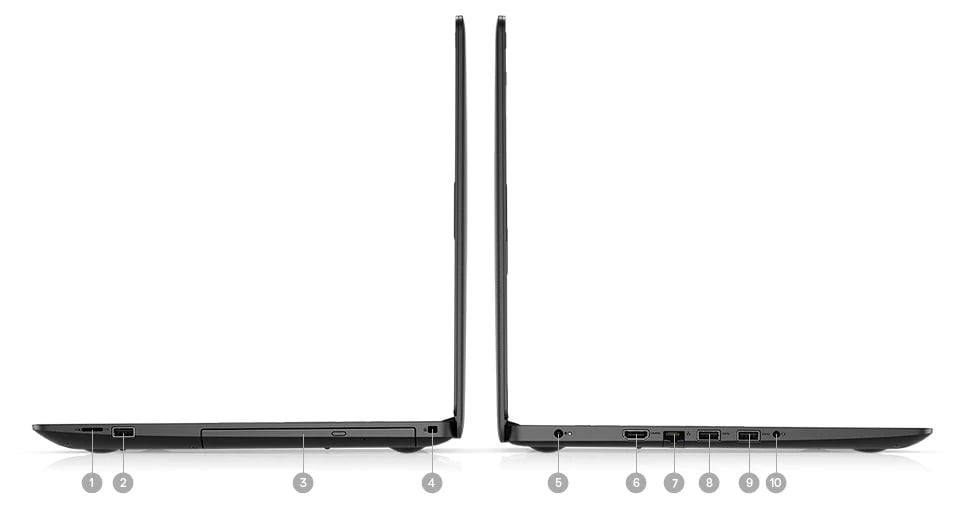 1. Czytnik kart microSD | 2. USB 2.0 | 3. Napęd optyczny | 4. Gniazdo blokady klinowej | 5. Gniazdo zasilania | 6. Port HDMI | 7. Port RJ45 GbE 10/100/1000 Mb/s | 8. Port USB 3.1 Type-A pierwszej generacji | 9. Port USB 3.1 Type-A pierwszej generacji | 10. Gniazdo słuchawek/mikrofonu