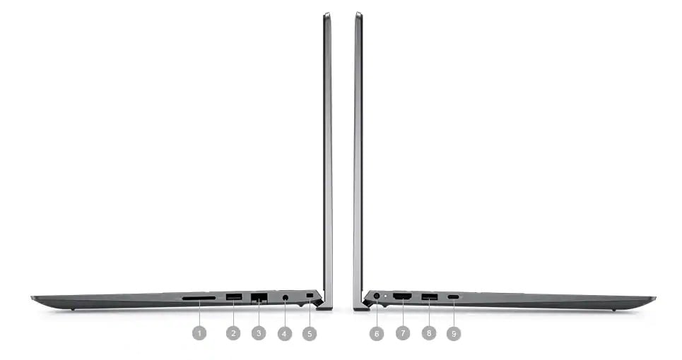 1. SD card reader | 2. USB 3.2 Gen 1 Type-A | 3. RJ45 | 4. Headset Jack* | 5. Wedge shaped lock | 6. Power jack | 7. HDMI 1.4b | 8. USB 3.2 Gen 1 Type-A | 9. USB 3.2 Gen 1 Type C™ (DP/PowerDelivery)