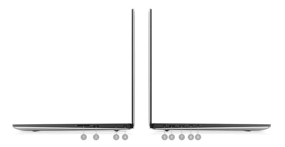 1. Gniazdo kart SD | 2. Port USB 3.1 Gen 1 | 3. Przycisk i wskaźnik baterii | 4. Gniazdo blokady klinowej | 5. Złącze przewodu zasilającego | 6. Port USB 3.1 Gen 1 | 7. Port HDMI 2.0 | 8. Port Thunderbolt™ 3 (4 tory PCI Express Gen 3) obsługujące zasilanie, port Thunderbolt™ 3 (połączenie dwukierunkowe 40 Gb/s), port USB 3.1 Gen 2 (10 Gb/s), macierzyste wyjście wideo DisplayPort 1.2, porty VGA, HDMI, Ethernet i USB-A przez adapter Dell (do nabycia osobno) | 9. Gniazdo słuchawkowe.