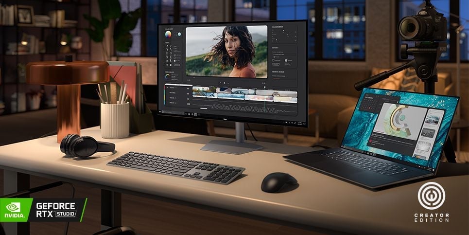 Dell XPS 17 z procesorem graficznym GeForce RTX oferuje dedykowane ray tracing, sztuczną inteligencję i sprzęt wideo do tworzenia treści nowej generacji. Dedykowane rdzenie śledzące promienie renderują piękne sceny z dokładnym oświetleniem, cieniami i odbiciami. Dedykowane rdzenie AI obsługują czasochłonne, powtarzalne zadania twórcze, takie jak zmiana taktowania wideo, poprawianie obrazu, dopasowanie kolorów, oznaczanie twarzy i przenoszenie stylu. A dedykowany sprzęt wideo umożliwia szybkie kodowanie i dekodowanie wysokiej jakości do edycji wideo i transmisji na żywo.