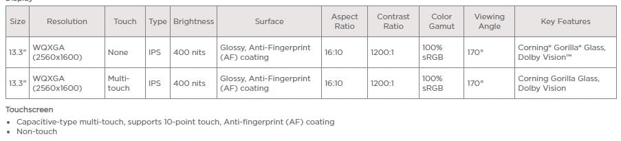 Laptopy Lenovo ThinkBook 13x ITG - to pierwsza generacji laptopów biznesowych Lenovo ThinkBook z serii 13x. Charakteryzują się 13,3-calową matrycą IPS o rozdzielczości WQXGA (2560x1600), wykorzystaniem procesorów Intel Core 11. generacji i wagą 1,13kg. Obie dostępne konfiguracje matryc (bez i z funkcją dotykową) posiadają jasność 400 nitów, kontrast 1200:1, powierzchnią wykończoną Corning Gorilla oraz certyfikatem Dolby Vision. Pamięć RAM dostępna o pojemności 8 lub 16GB LPDDR4x-4266 (wlutowana, bez możliwości rozbudowy). Magazynem danych są dyski SSD PCIe NVMe, PCIe 3.0 x4 o pojemności od 256GB do 1TB. Posiadają dwa głośniki Stereo o mocy 2W x2, Dolby® Atmos®, HARMAN-branded oraz cztery mikrofony 360° a kamera 720p posiada mechaniczną przesłonę. Wbudowany akumulator Li-Polymer 53Wh zapewnia czas pracy do 12,5 godziny. Laptopy z tej serii wykończona są aluminium (klapa matrycy oraz spód) a wymiary to 298 x 209 x 12.9 mm przy wadze niewiele większej od 1kg. Za łączność bezprzewodową odpowiadają technologie takie jak: Wi-Fi 6, 802.11ax 2x2 Wi-Fi + Bluetooth 5.2. A za wsparcie bezpieczeństwa: Discrete TPM 2.0, TCG certified, czytnik linii papilarnych oraz przesłona kamery. Notebooki z tej serii otrzymały certyfikat MIL-STD-810H.