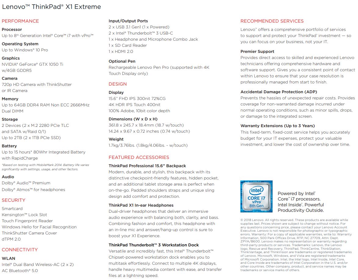 Laptopy Lenovo ThinkPad X1 Extreme dostępne będą w konfiguracjach z procesorami firmy Intel z 8. generacji H. Maksymalna ilość Pamięci RAM to 64GB (2x32GB) o taktowaniu 2666Mhz. Magazyn danych może składać się z dwóch dysków SSD o łącznej pojemności 2TB (złącze M.2, interfejs NVMe PCIe). Kartą graficzną jest mobilny układ firmy NVIDIA GTX 1050Ti z 4GB pamięci VRAM. Czas pracy na baterii to do 13 godzin. Dostępne są modele z matową matrycą FHD (1920x1080) pokrywającą 100% przestrzeni barw sRGB, jak również modele dotykową, matową matrycą UHD pokrywającą 100% przestrzeni barw palety Adobe RGB. Laptopy wyposażone są w dwa porty USB-A, dwa USB-C Thunderbolt 3, gniazdo słuchawkowe oraz port zasilania. Dołączony do laptopa zasilacz sieciowy ma moc 135W.