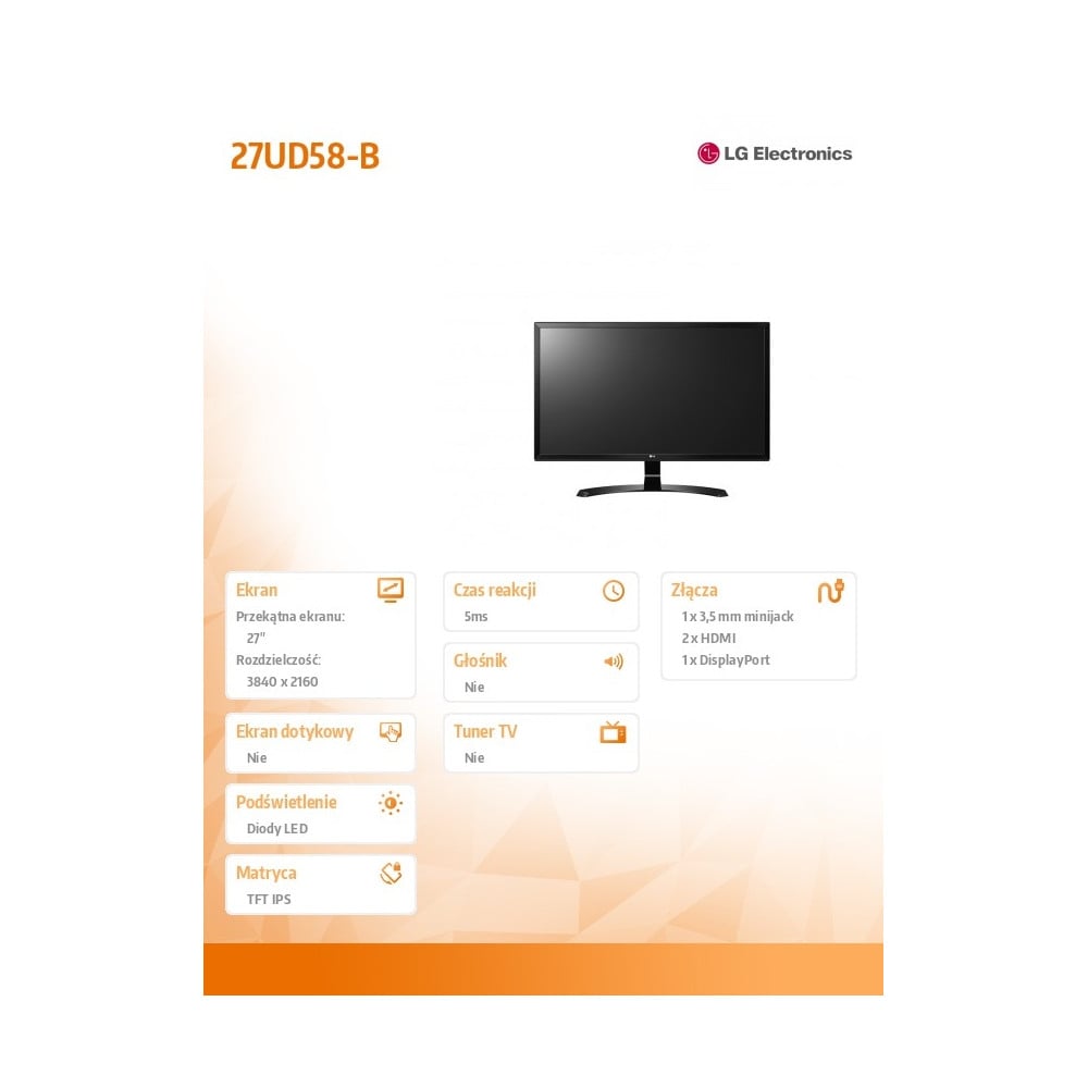 Monitor LG 27UD58-B należy do cieszącej się dużą popularnością wśród użytkowników biznesowych rodziny 27-calowych urządzeń od LG. 27-calowy ekran wyświetla obraz w rozdzielczości natywnej 4K (3840x2160). Obraz jest wyświetlany w formacie 16:9. Matryca została wykonana w technologii IPS. Producent urządzenia deklaruje jasność matrycy na poziomie 250 cd/m². Zastosowana matryca zapewnia kąty widzenia 178° w pionie i 178° w poziomie. Czas reakcji matrycy wynosi 5 ms. Ważną cechą monitora jest pokrycie ekranu. Częstotliwość odświeżania matrycy wynosi 61 Hz (w nominalnej rozdzielczości). Zastosowana matryca pozwala na wyświetlanie 1,1 miliarda kolorów. Monitor spełnia normy certyfikatów Energy Star, EPEAT Gold, RoHS oraz CE. Podzespoły urządzenia zainstalowano w obudowie w kolorze czarnym. Waga modelu wynosi 5,6 kg. Średni pobór mocy podczas pracy i w trybie czuwania wynosi odpowiednio 40,0 W oraz 0,3 W.